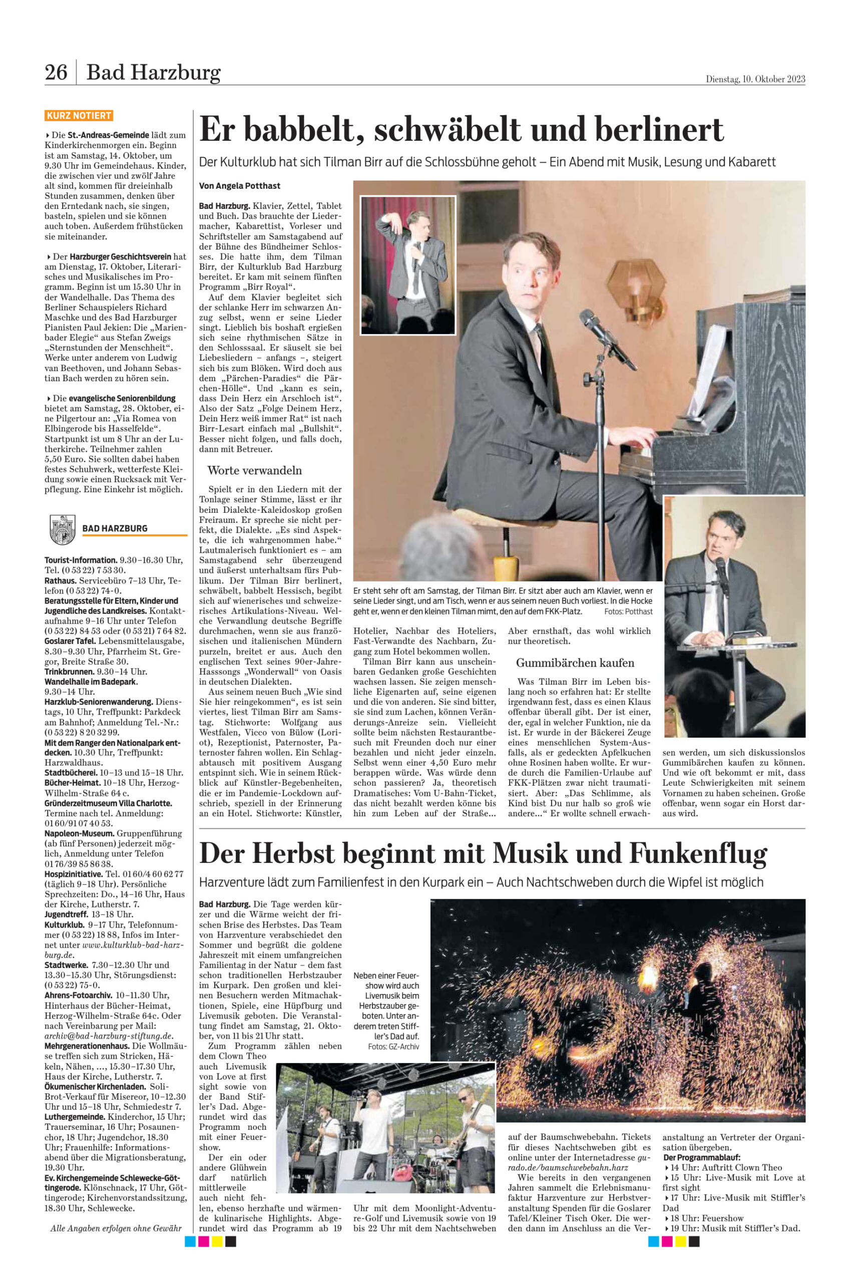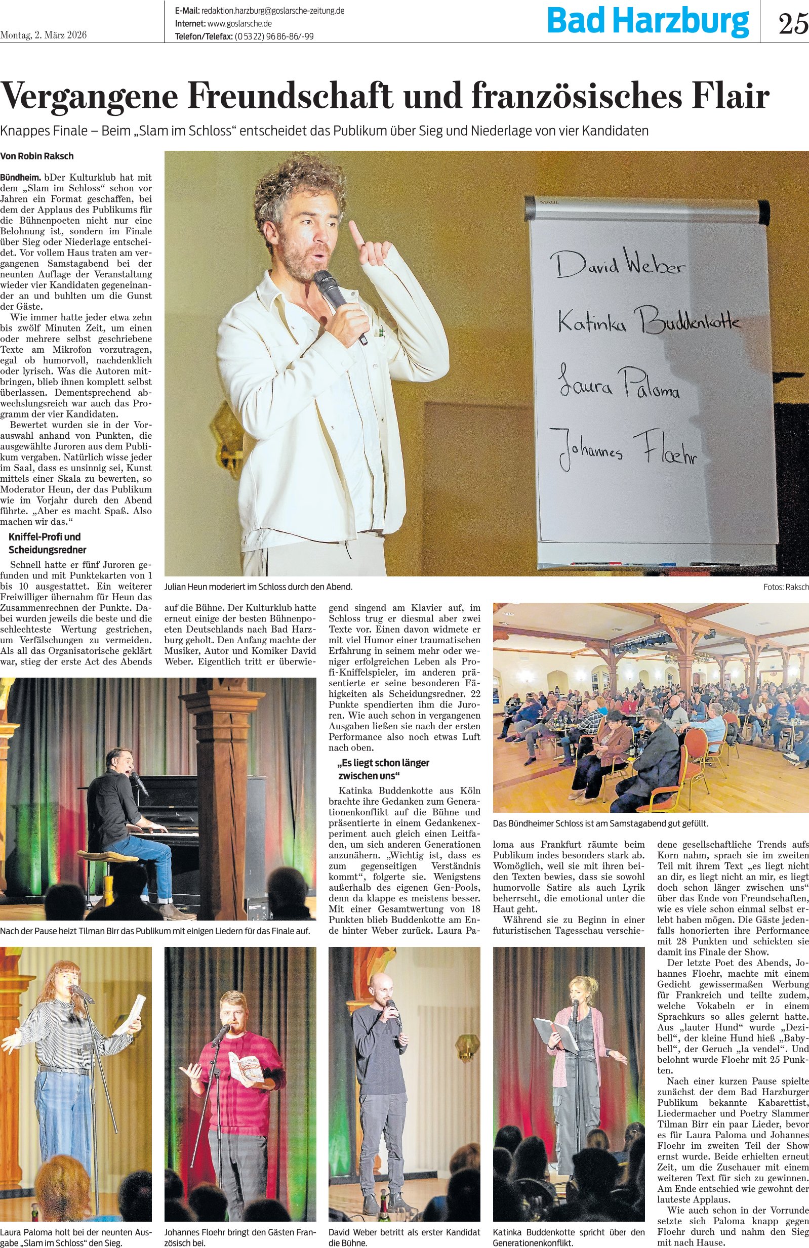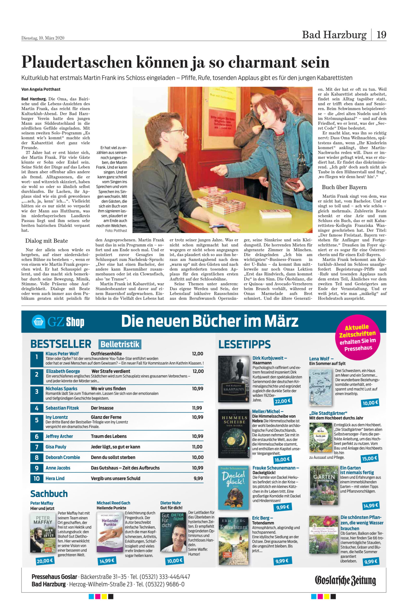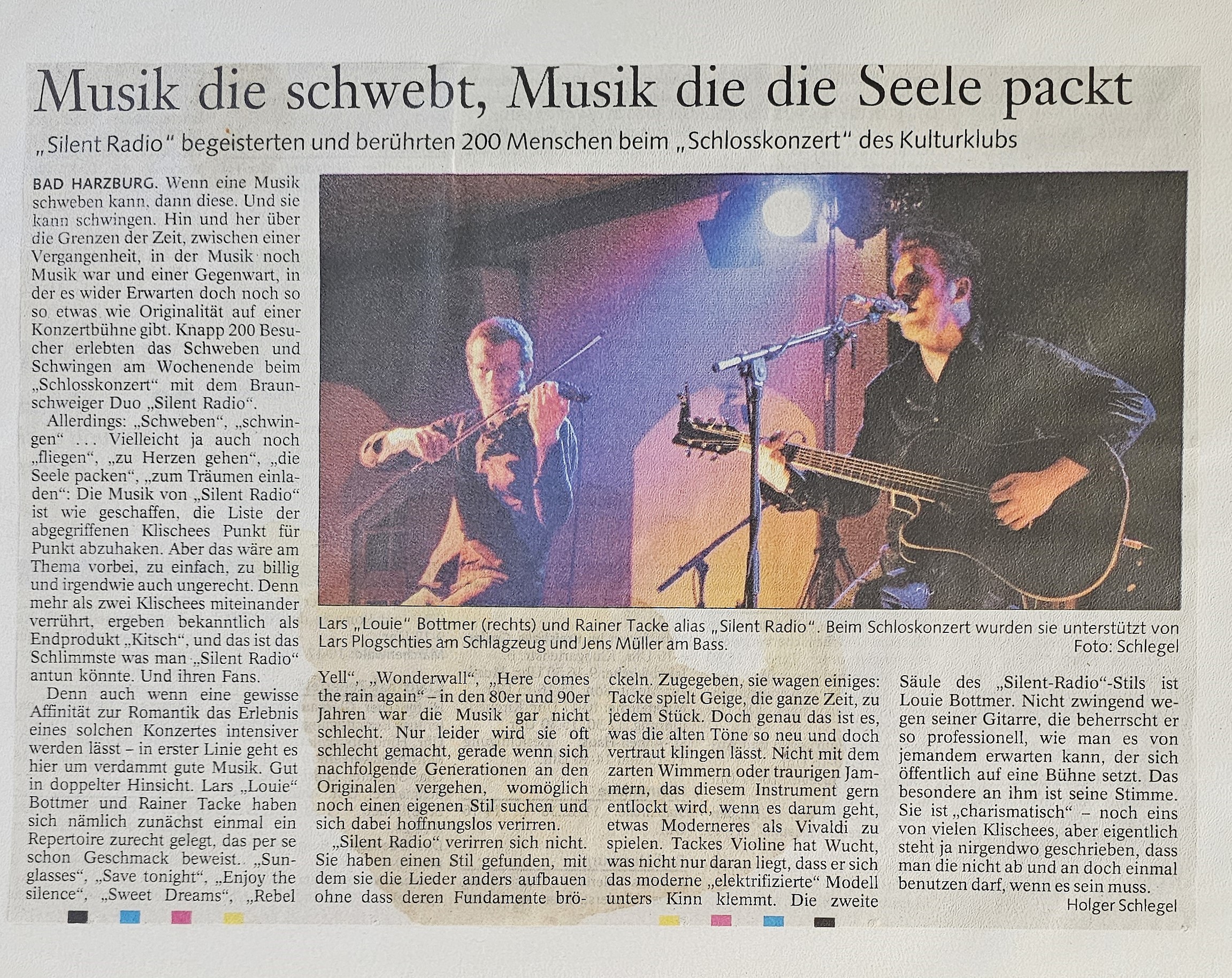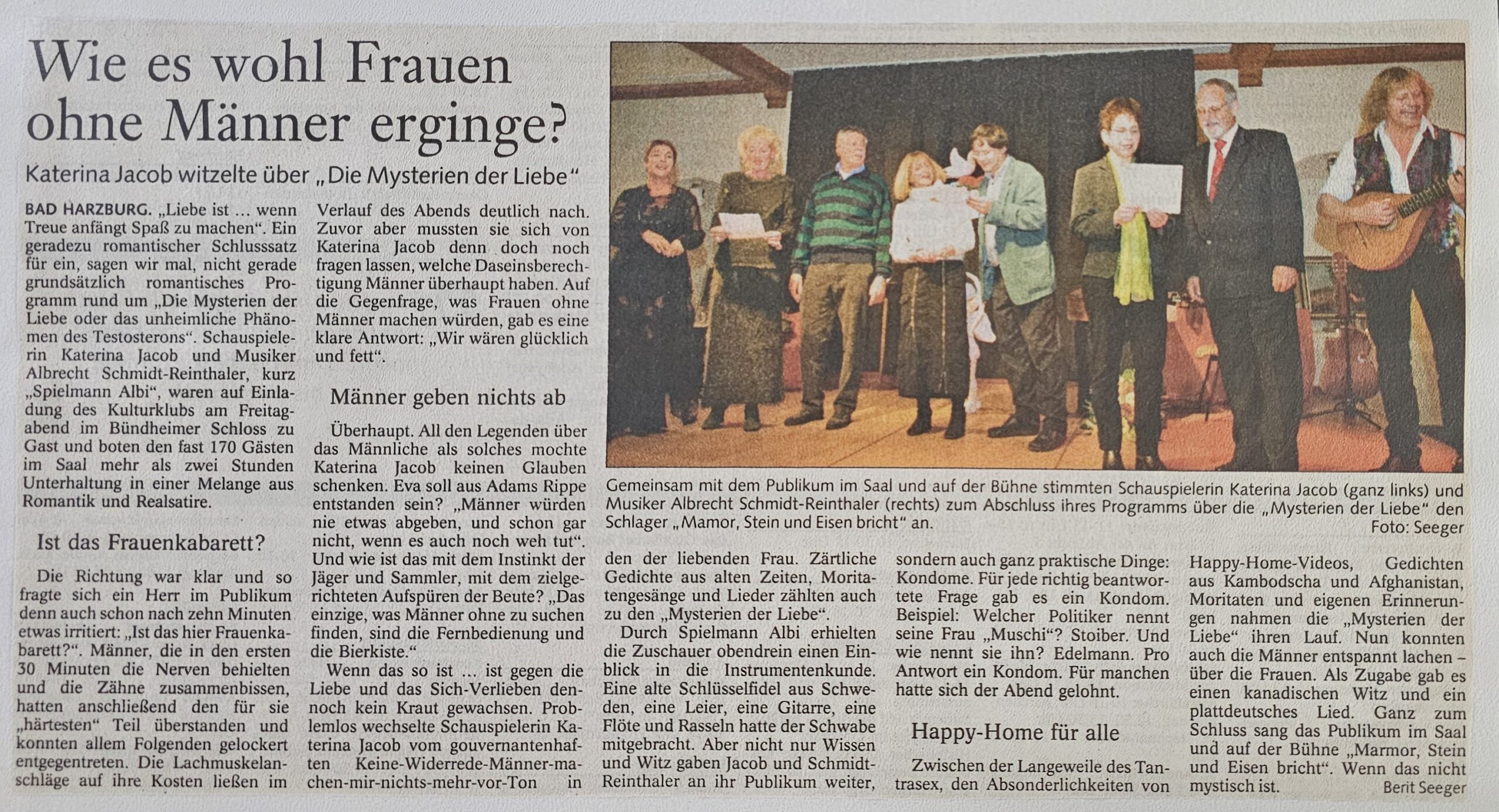 An dieser Stelle präsentieren wir Ihnen die Rezensionen unseres Programms aus der „Goslarschen Zeitung“. So können Sie noch einmal in Erinnerungen schwelgen und unsere Veranstaltungen in Ruhe Revue passieren lassen.