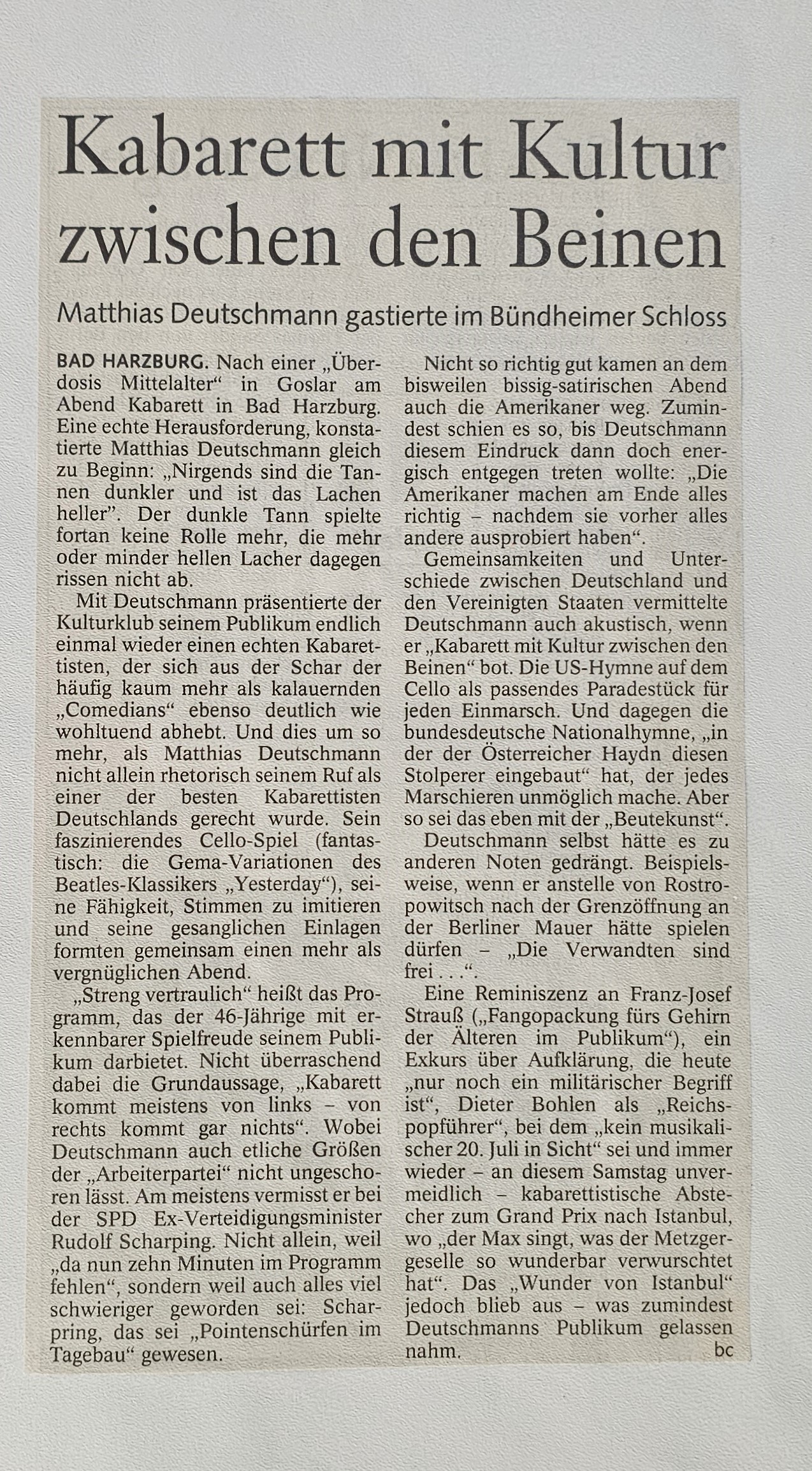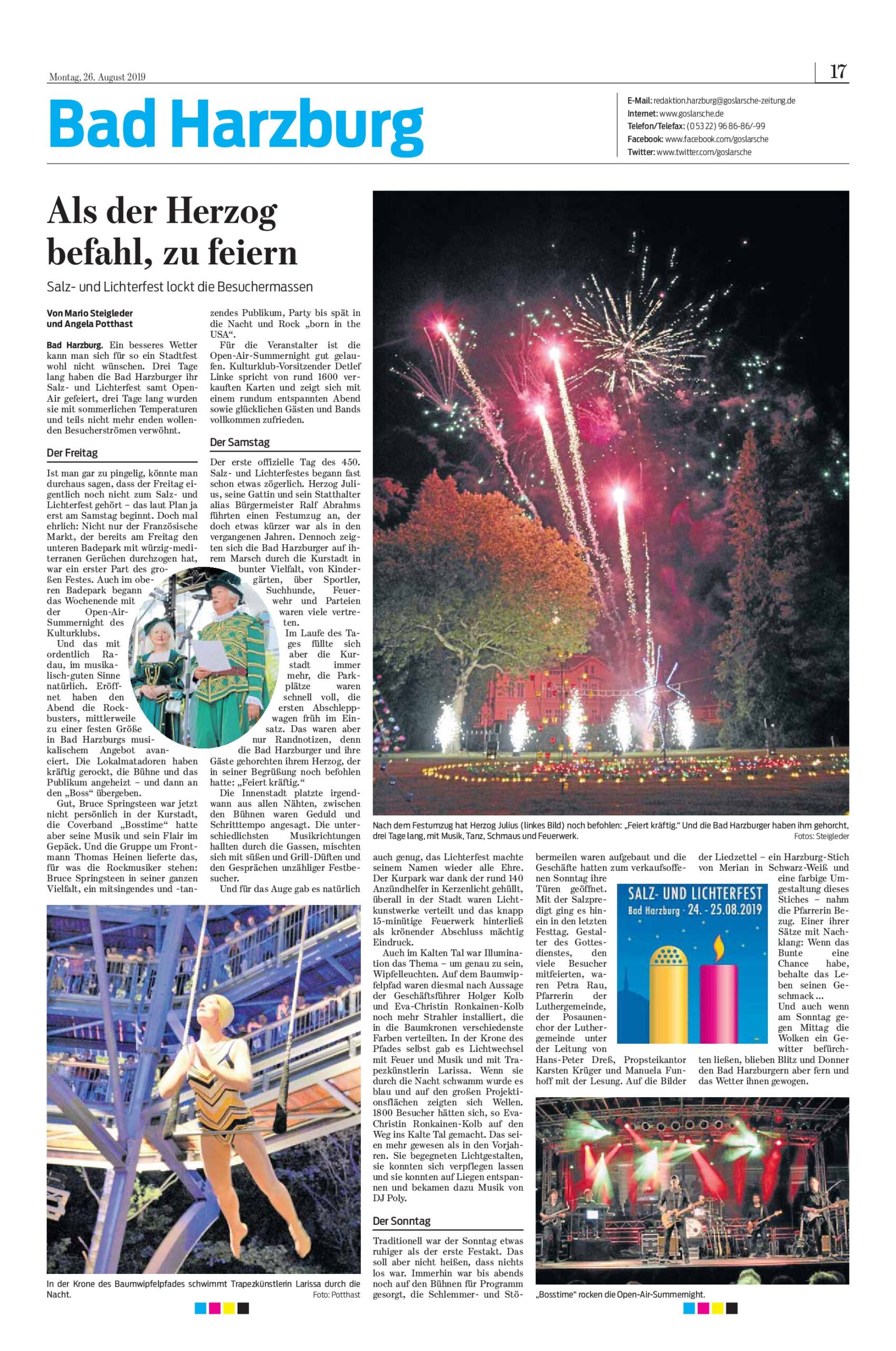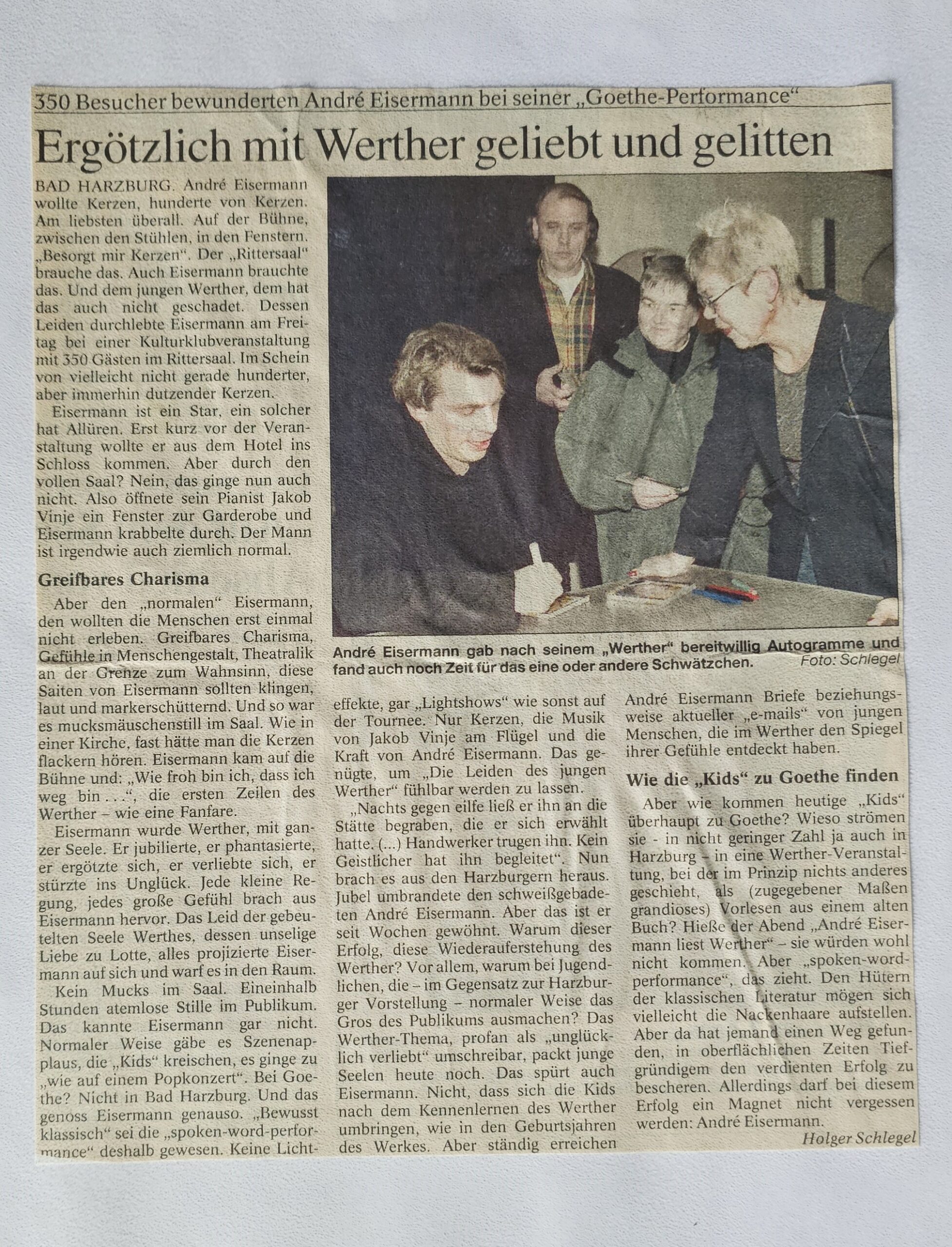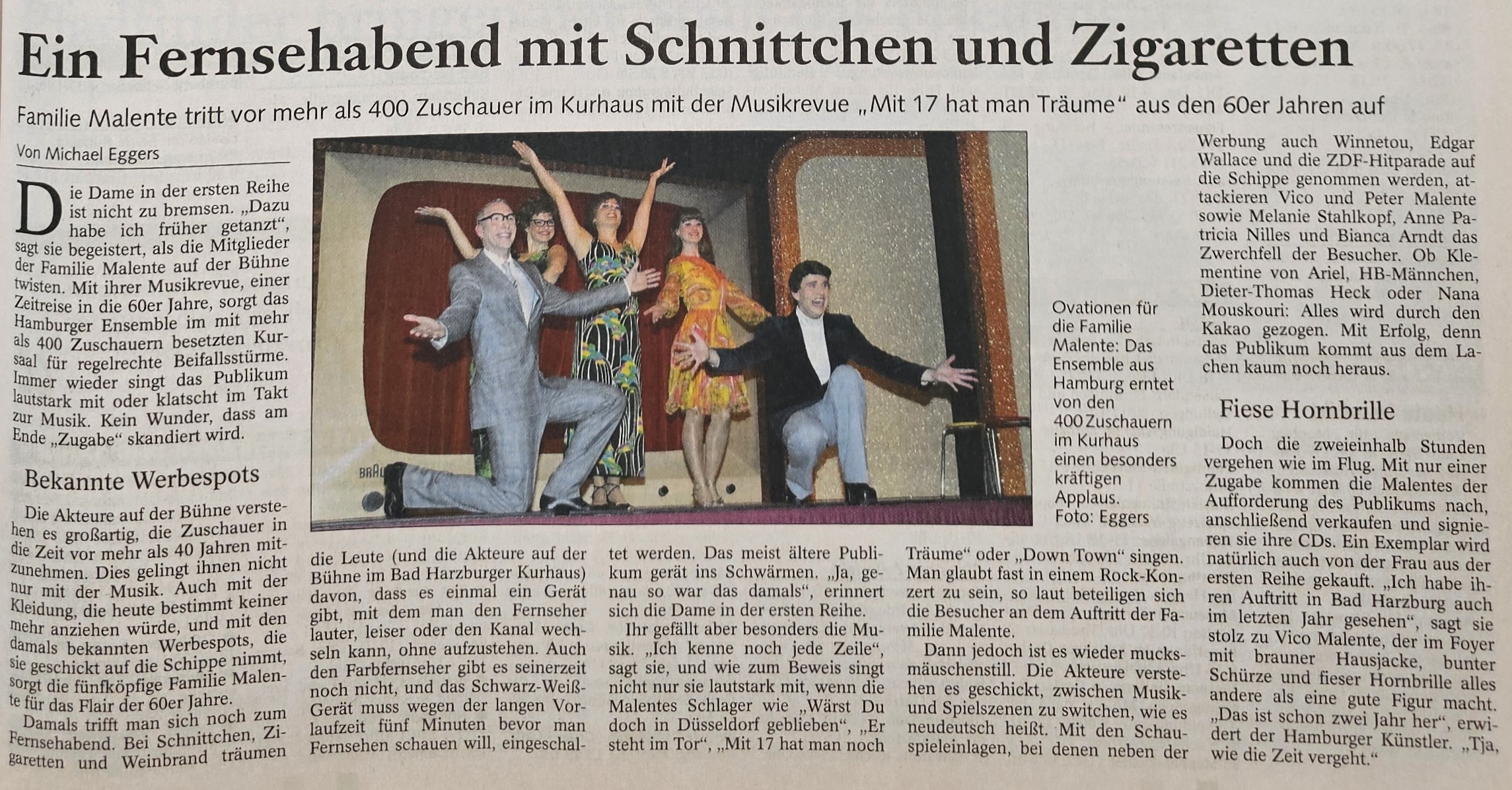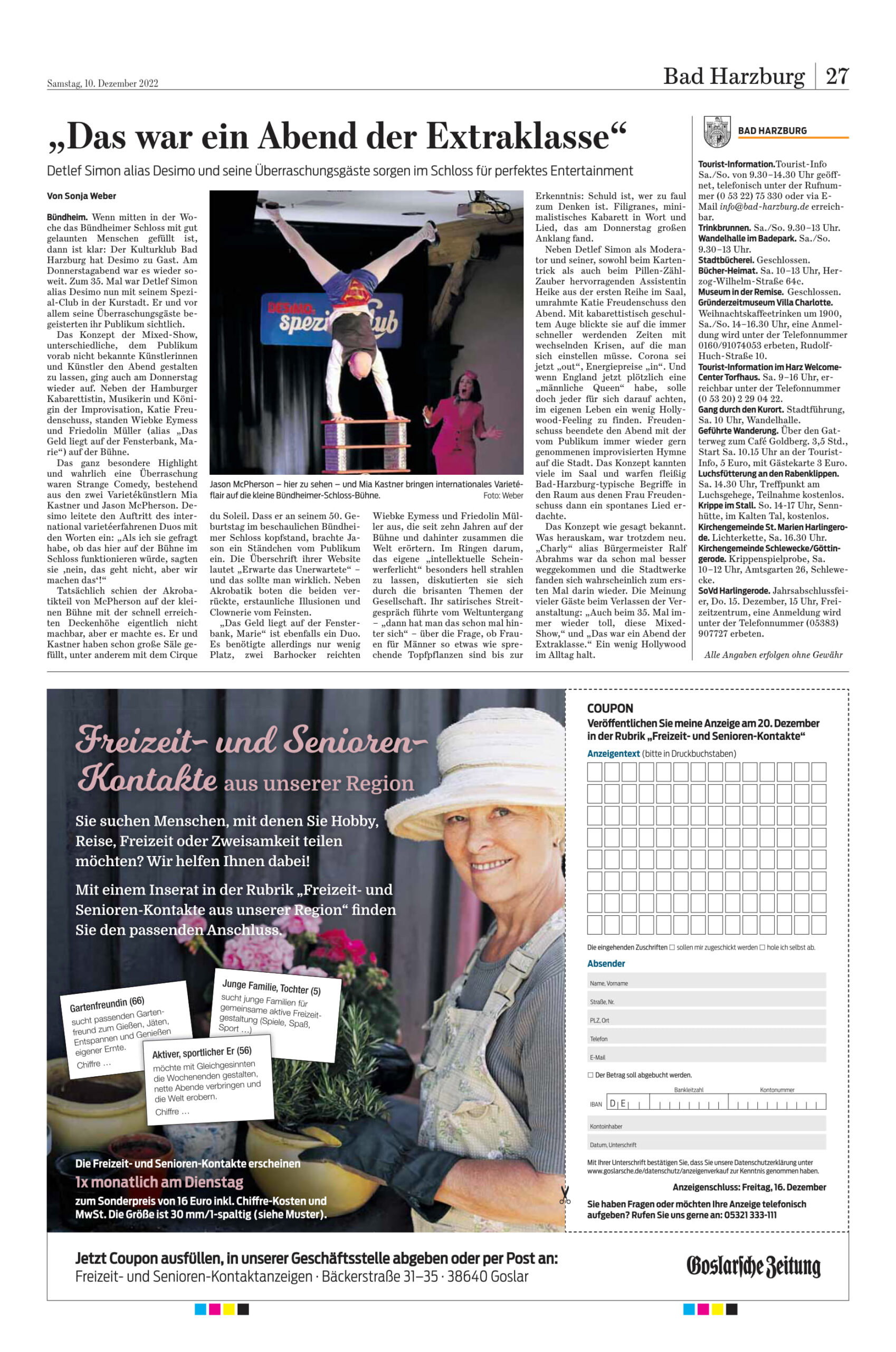 An dieser Stelle präsentieren wir Ihnen die Rezensionen unseres Programms aus der „Goslarschen Zeitung“. So können Sie noch einmal in Erinnerungen schwelgen und unsere Veranstaltungen in Ruhe Revue passieren lassen.
